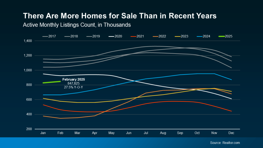 Look at the graph below and follow the green line for 2025. You can see, even though inventory levels still haven’t returned to pre-pandemic norms (shown in gray), that number is higher than it has been going into the spring market over the past few years (see graph below):